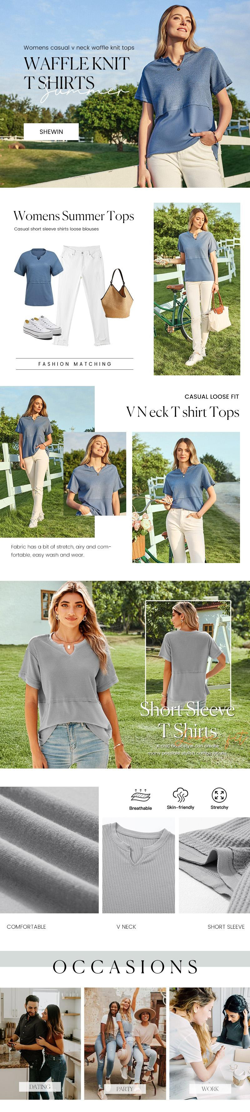 Elevate Your Style with Comfort! Waffle knit tops feature a V-neck design, loose fit, and short sleeves. These basic tunic tops come in solid colors, offering versatile styling options. Perfect for creating chic, casual looks. The fabric is 100% Polyester, with a bit of stretch, ensuring comfort and ease of care. Ideal for spring and summer outfits.