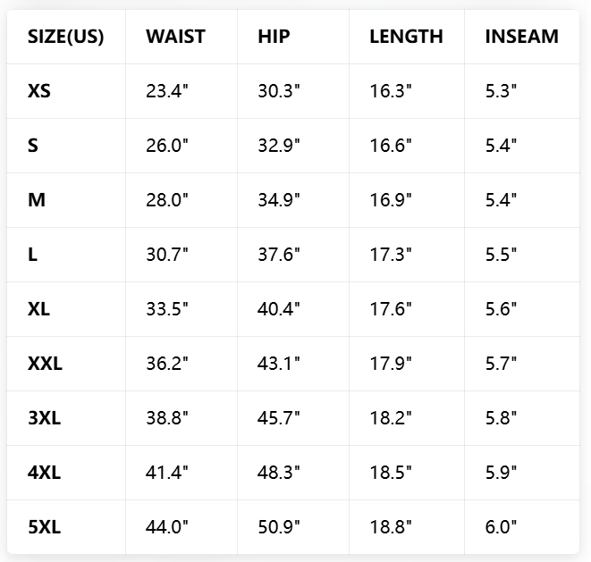 SHORTS SIZE CHART (inch)