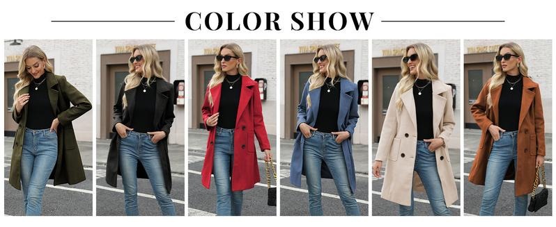 Design features a classic double-breasted notch lapel with front button closure, functional side pockets, and decorative back buttons, presenting an elegant silhouette through its mid-length solid color design and long sleeves.