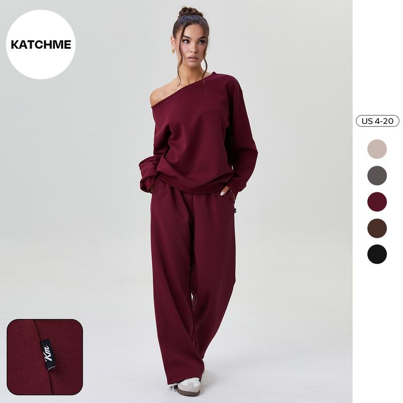 Made from soft, solid-colored fabric, this set features a stylish sloping shoulder design and long sleeves, paired with matching trousers for an elegant appearance.