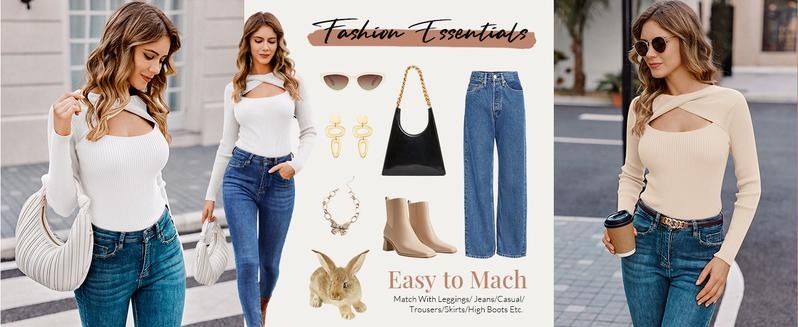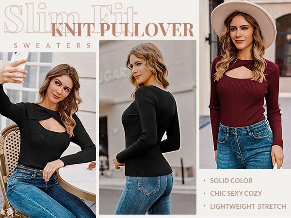 ·【UNIQUE DESIGN】: Fall Clothes For Women 2023/Long Sleeve Pullover For Women/Sexy Cutout Tops For Women/Rib Knit Sweaters For Women/Crew Neck Sweater For Women/Fall Sweaters for Women/Slim Fit Pullovers For Women/Casual Plain Sweater For Juniors/Fitted Tops For Women