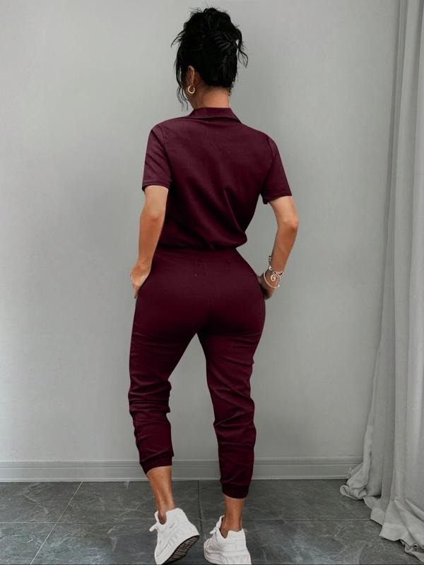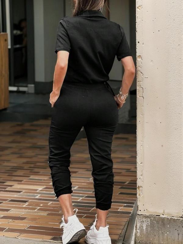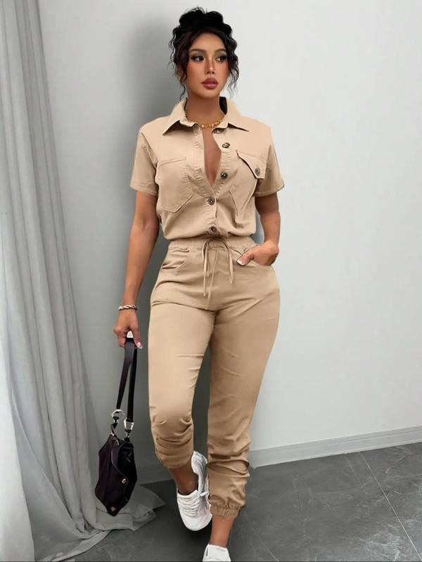 Women's Solid Button Front Pocket Jumpsuit, Casual Short Sleeve Jumpsuit for Daily Wear
